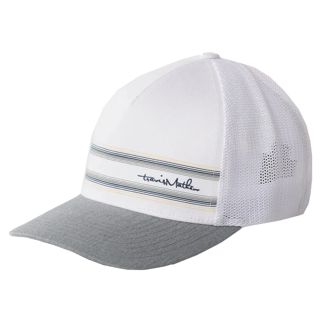 Stay cool and comfortable during your next golf round with the TravisMathew Toasted Hat. The Toasted hat has stripes across the front panel and TM script logo that adds a finishing touch of style to your golf wardrobe. The mesh back provides airflow to keep you cool and the pre-curved brim will keep the sun out of your face.